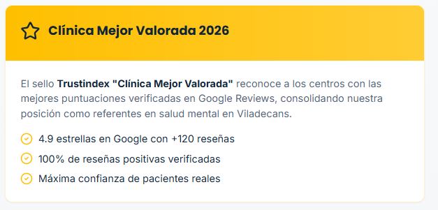 Nuestra clínica ha sido distinguida como la Clínica mejor valorada 2026, una acreditación verificada por Trustindex que garantiza la transparencia y calidad de nuestro servicio. Con una comunidad de más de 230 opiniones en Doctoralia y más de 120 reseñas positivas en Google, nuestro compromiso es ofrecerte una terapia cercana, profesional y, sobre todo, efectiva.
