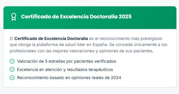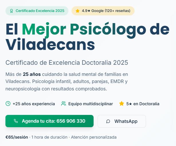 Mejor psicólogo en Viladecans. Con más de 25 años de trayectoria ofreciendo servicios terapéuticos en Viladecans, nuestro centro se consolida como el referente local en bienestar emocional. No lo decimos nosotros, lo dicen quienes confían en nosotros: por segundo año consecutivo, hemos sido galardonados con la Certificación de Excelencia de Doctoralia, un reconocimiento basado exclusivamente en las experiencias reales de los pacientes.